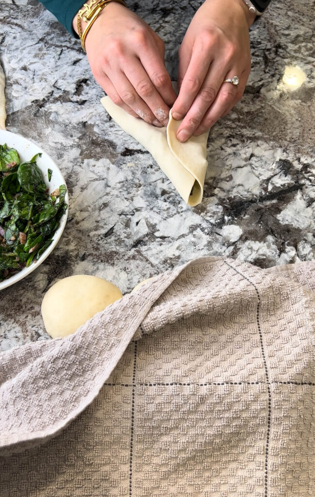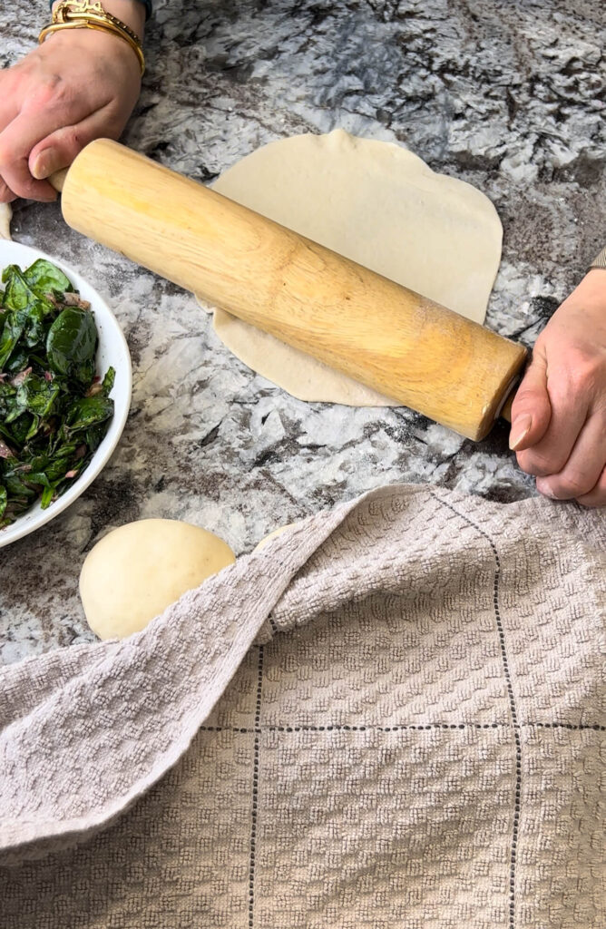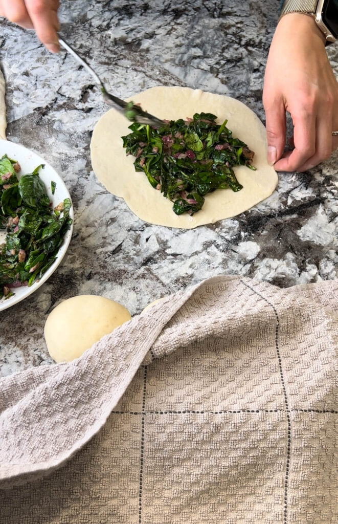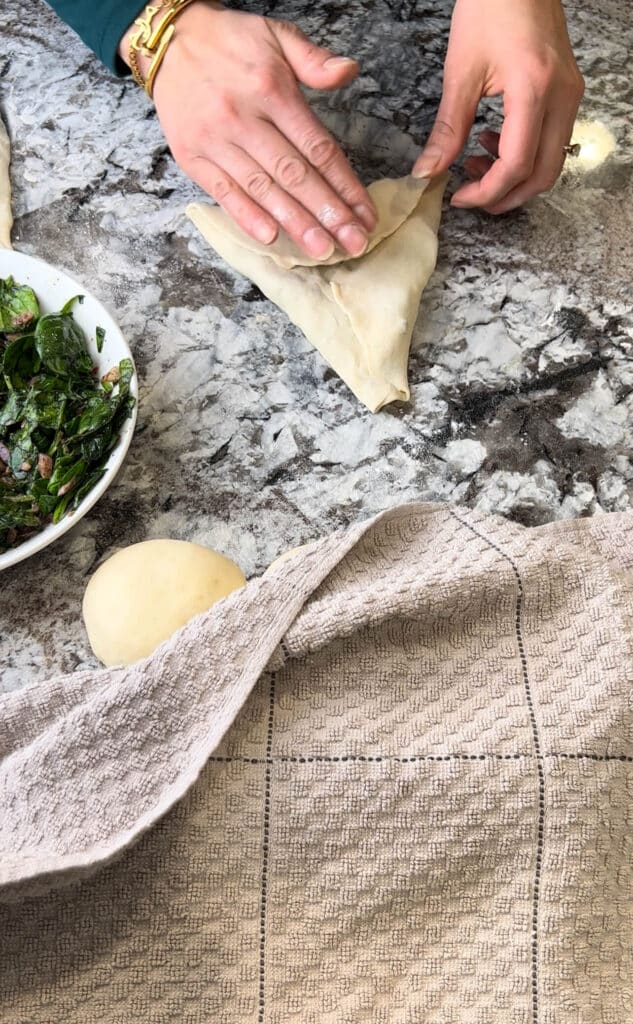 • Lightly flour your surface and roll each dough ball into a very thin circle. Place a spoonful of the spinach mixture in the center and fold into a triangle shape. Press the edges to seal. Repeat until all are done.