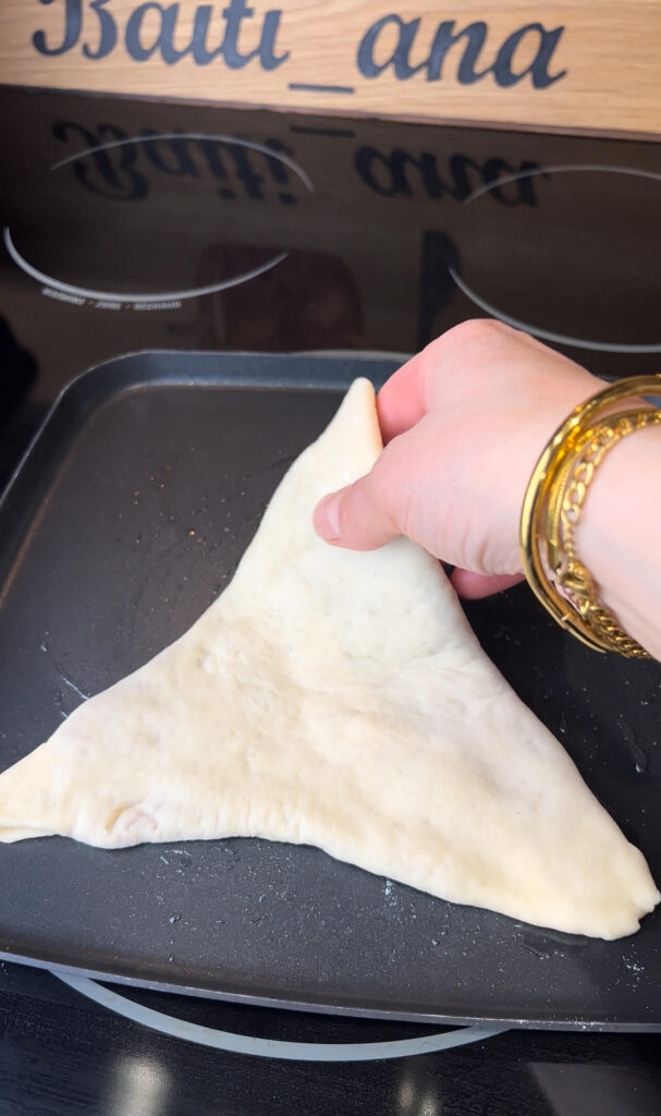 Place a spoonful of the spinach mixture in the center of each circle. Fold the dough into a triangle and pinch the edges well to seal.