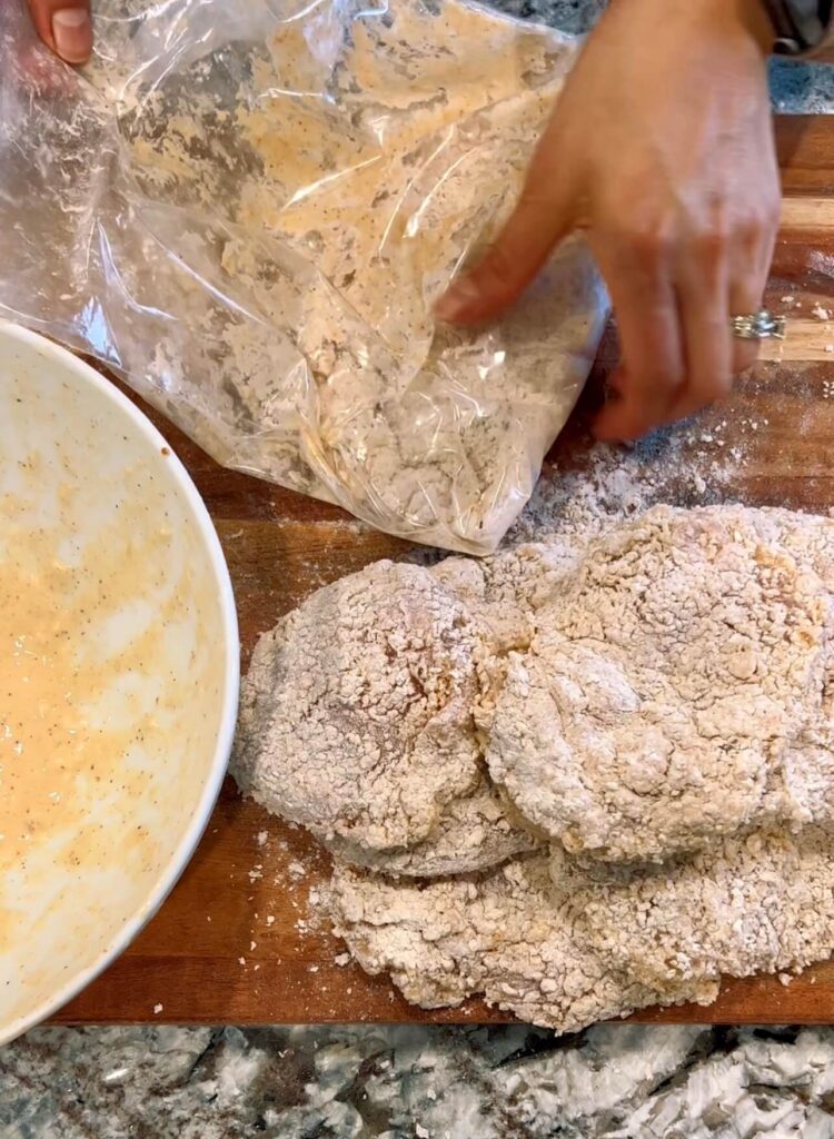• Place one piece of chicken at a time into the bag and shake until it’s fully coated. Repeat with the remaining pieces.