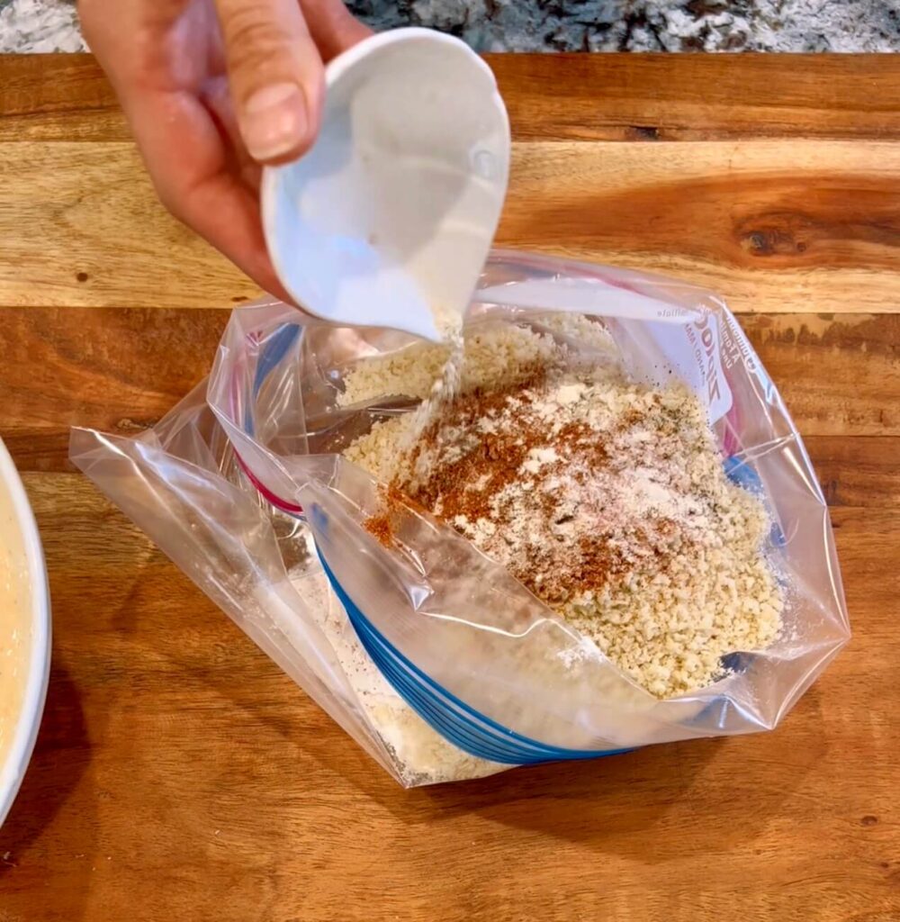• In a large ziplock bag or bowl, combine the flour, panko breadcrumbs, salt, black pepper, paprika, and garlic powder for the coating.