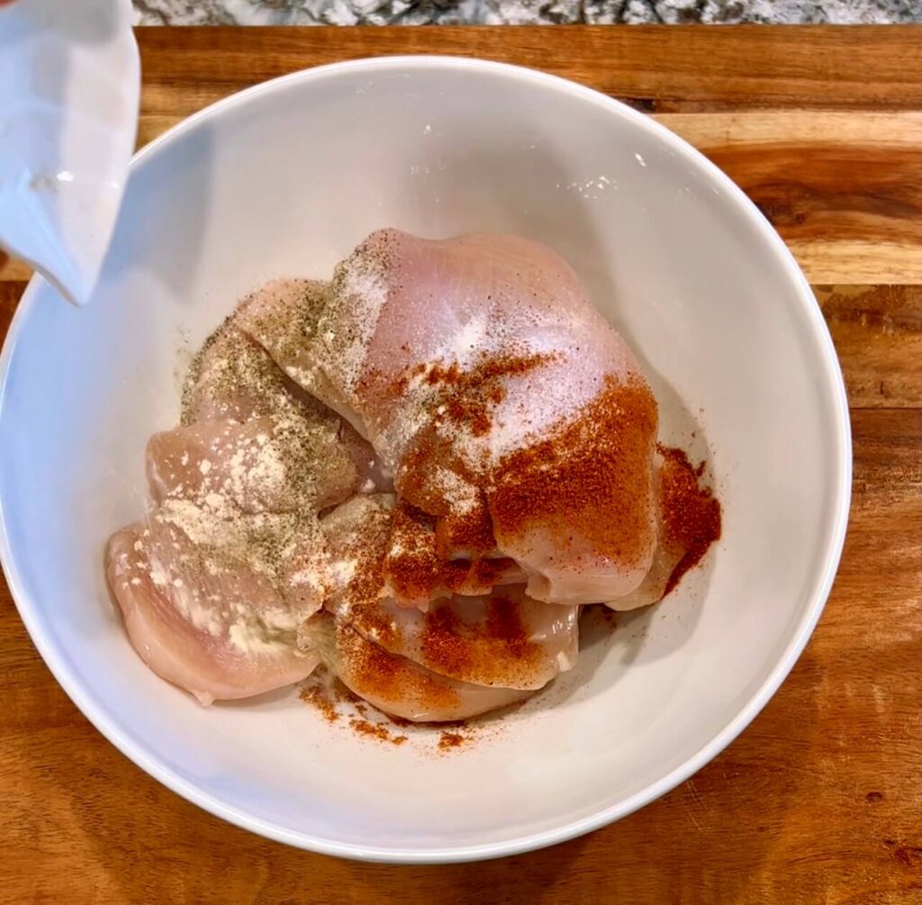 • Season the chicken with the salt, paprika, black pepper, and garlic powder.