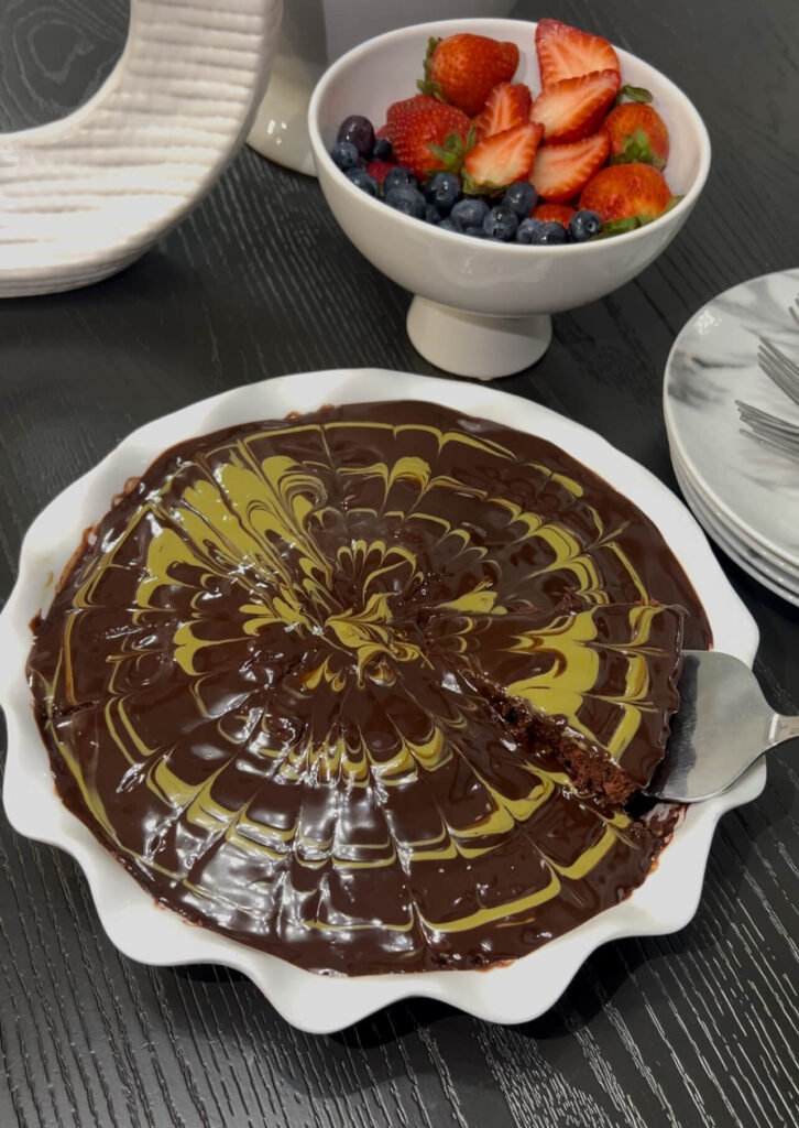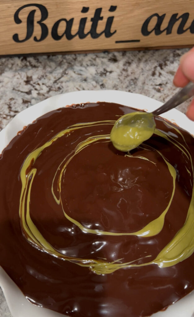 Pour the ganache over the hot cake and spread evenly. Optionally, add pistachio cream and create designs using a toothpick.