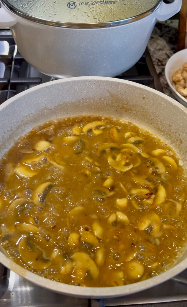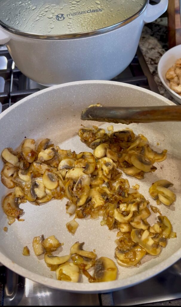 - In the same pan, add the remaining olive oil and sauté the onion until soft. Add the minced garlic and cook for a few seconds, then add the sliced mushrooms and cook for a couple of minutes.