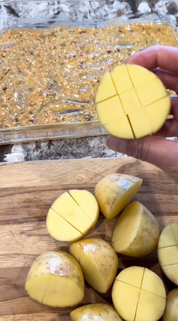 - Cut — Slice each potato in half. Lay the half flat side down and make a couple of shallow scores on the flat surface (this helps the butter-parmesan mixture cling and stamps in more flavor).