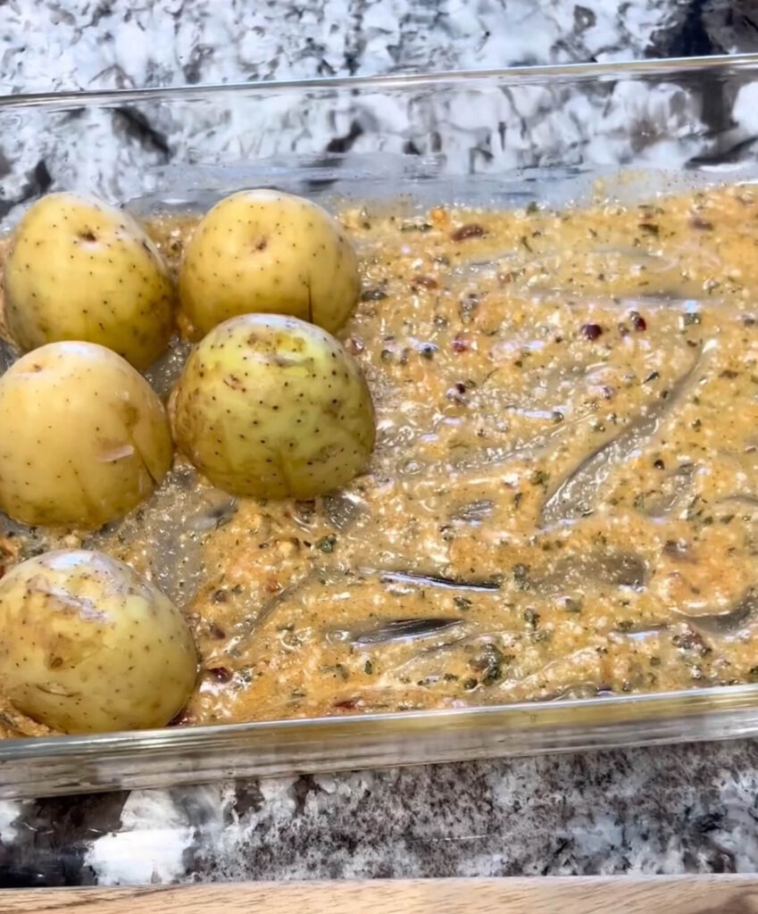 - Spread — Spread that mixture evenly across the bottom of the dish so each potato will sit on some of it.