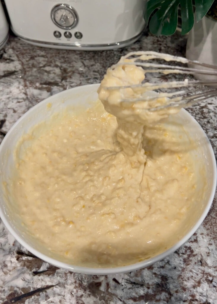 - Add the melted butter, cream-style corn, and warm water. Mix until smooth.