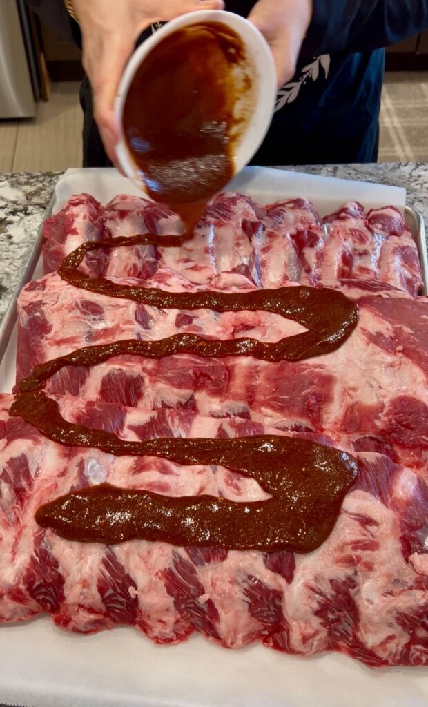 Place the ribs on the tray and pour the sauce over them, rubbing it all around so every part is coated evenly.