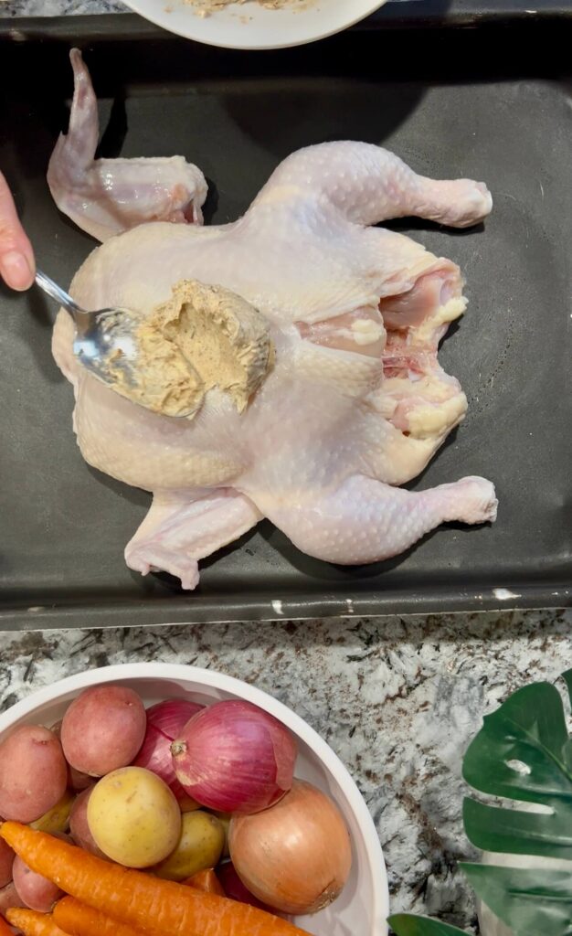 • Season the chicken: Spread the garlic butter all over the chicken—on the outside, inside the cavity, and especially under the skin. This helps the flavor go everywhere.