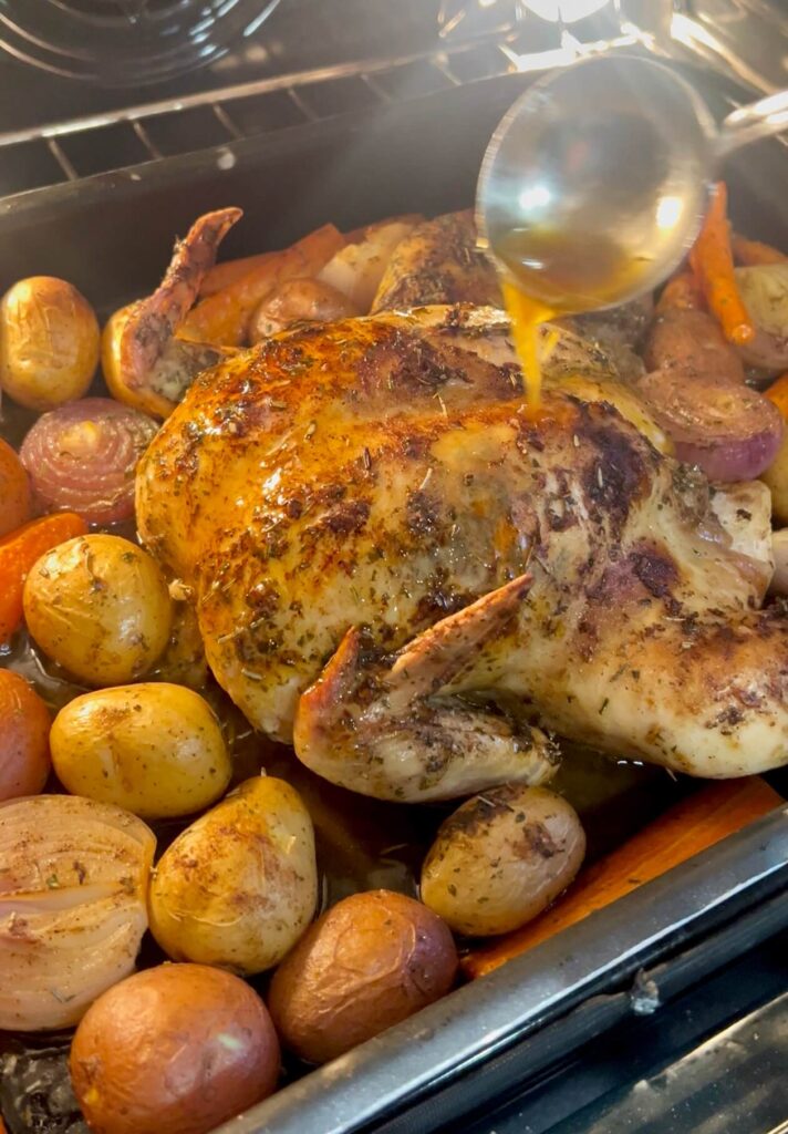 After 30 minutes, spoon some pan juices over the chicken. Repeat 1–2 more times during roasting.