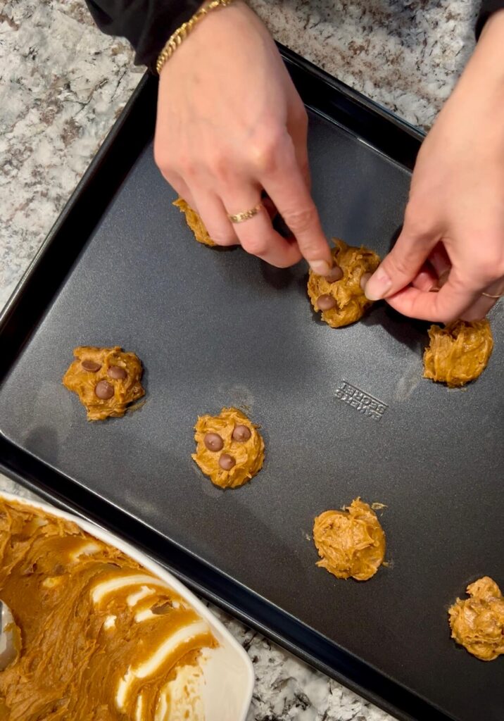 5. Scoop the dough using two spoons and place 12 equal portions onto the baking sheet, leaving space between each cookie.