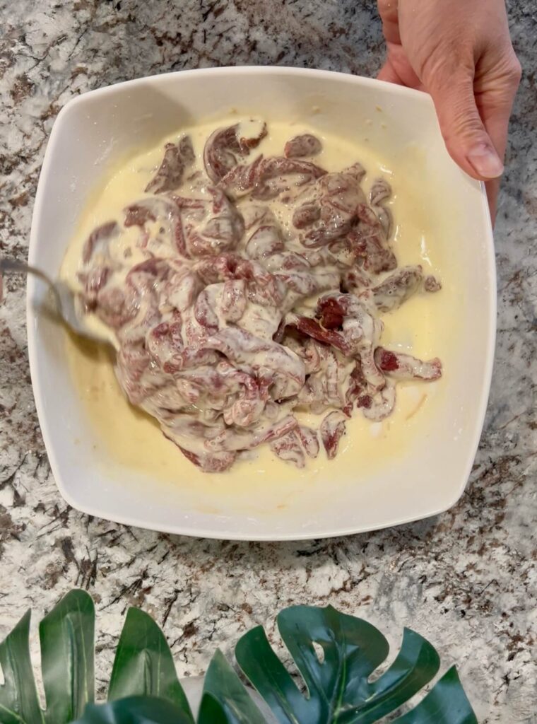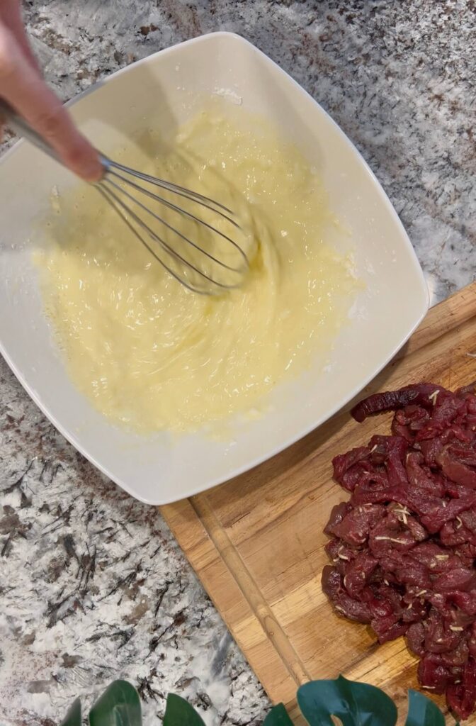 - In a bowl, whisk the eggs, cornstarch, and water until smooth. Add the marinated beef and mix until well coated.
