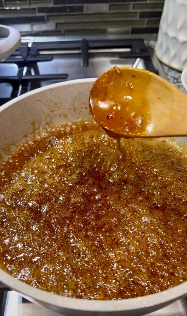 Add honey (or sugar), soy sauce, rice vinegar, sesame oil, and chili flakes. Stir well and let everything come together. - Thicken the sauce