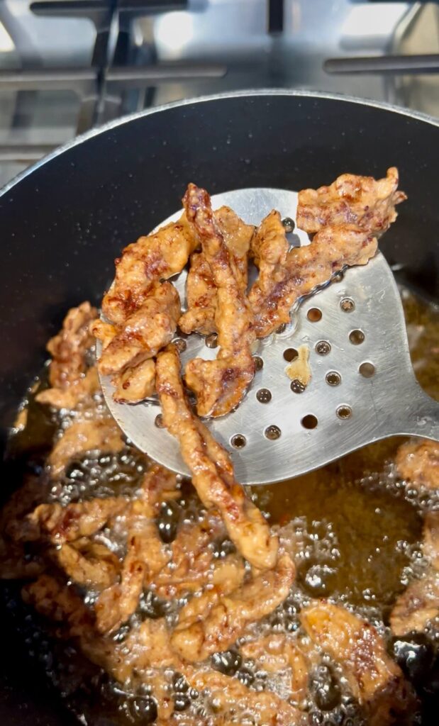 Heat vegetable oil in a deep pot over medium-high heat. Fry the beef in batches, dropping the strips in one by one. Cook until golden and crispy, then remove and set aside. - Start the sauce