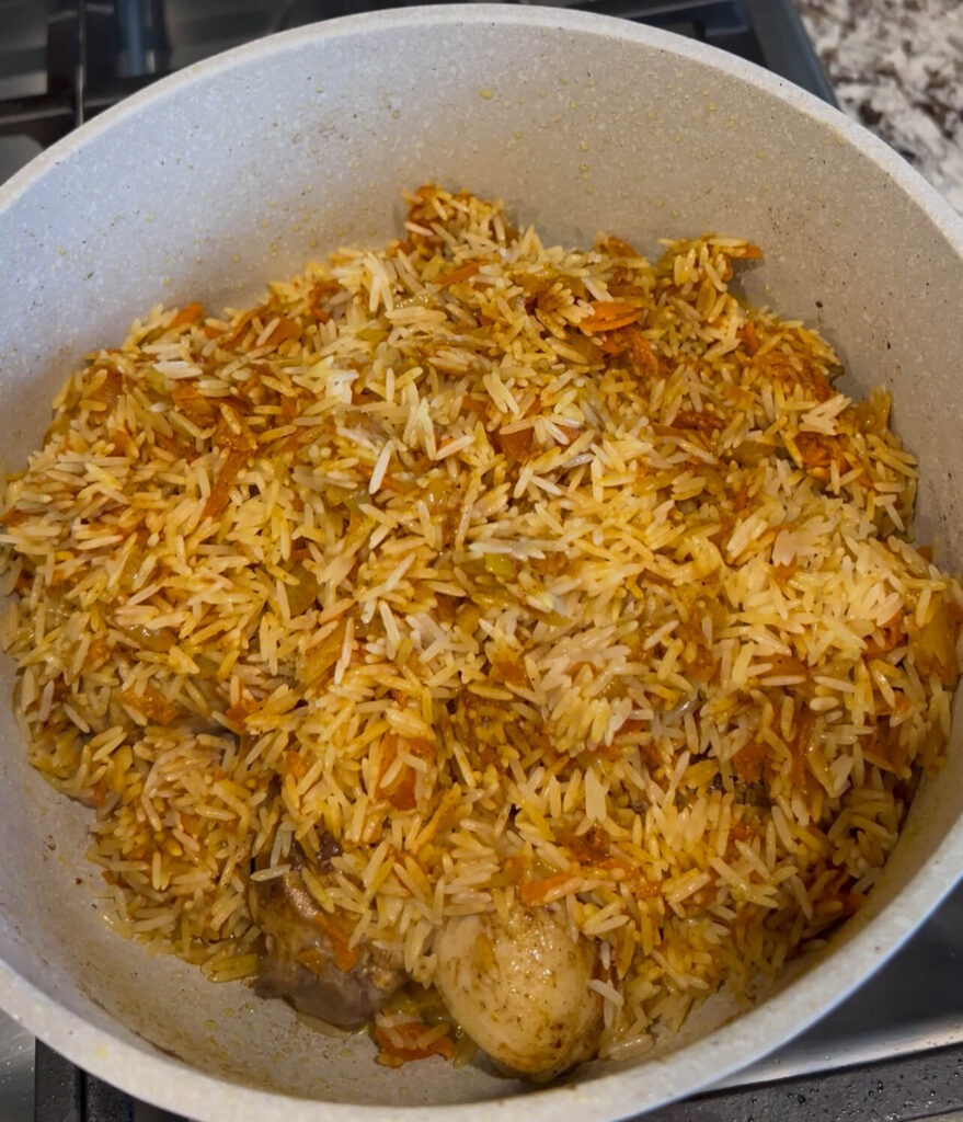 One-Pot Chicken Kabsa is a take on the traditional kabsa, but in a much easier and more practical way. Instead of cooking the chicken separately and the rice on its own, everything is cooked together in one pot, which means less mess and more flavor. There’s also no need to use the oven to brown the chicken — it’s perfectly browned right in the same pot.