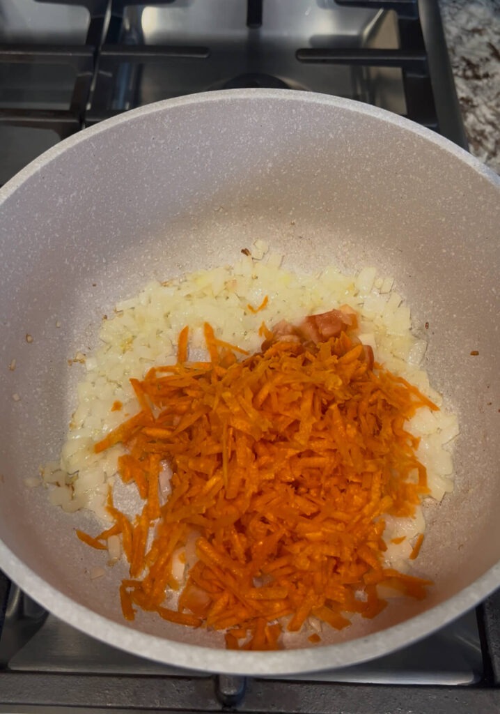 In a large pot, heat some oil and sauté the chopped onion and garlic for about 1 minute until fragrant. Add the shredded carrot and diced tomato and cook for another minute. - Add spices and tomato paste: