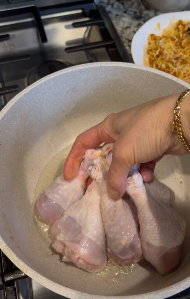 - In the same pot, add a little more oil, then add the chicken. Season with kabsa spice and a little salt, and brown on both sides.