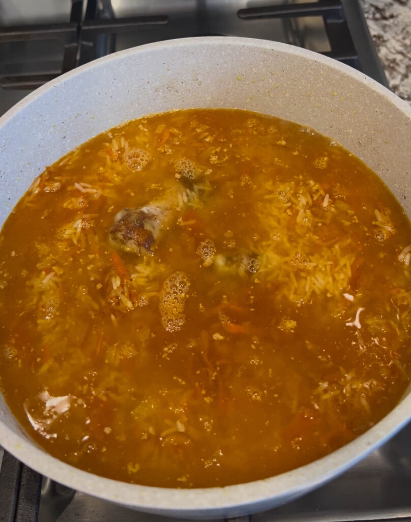 - Add the rice mixture back to the pot. Add the hot water mixed with the chicken bouillon cube (or use chicken broth instead).