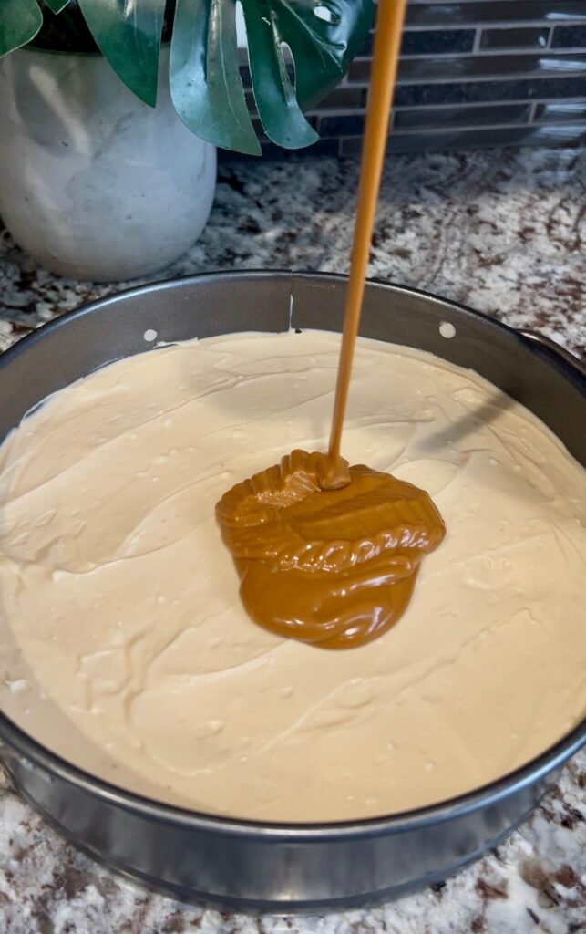 • Microwave the Biscoff spread for a few seconds until runny, then pour it over the cheesecake and spread evenly.