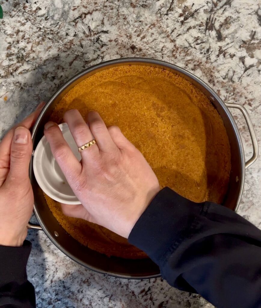 Line a springform pan with parchment paper and press the cookie mixture firmly and evenly into the bottom to create a strong, even base, then place it in the fridge to set while you prepare the filling.